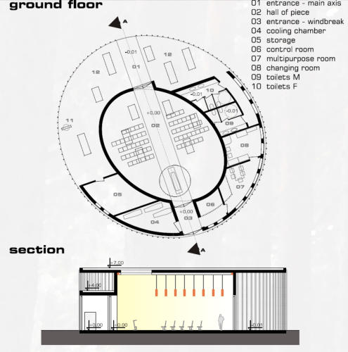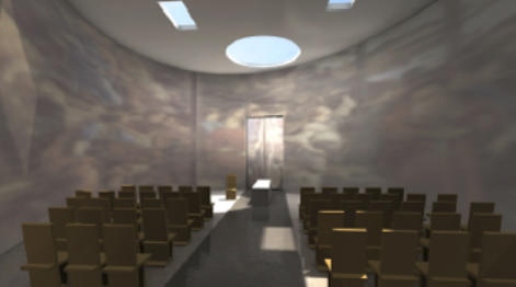 Chappel of peace has 70 seats and 100 stances. Through the main axis twisted elliptical