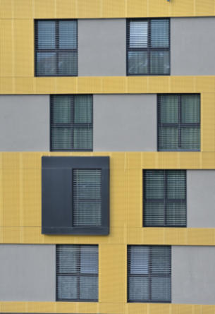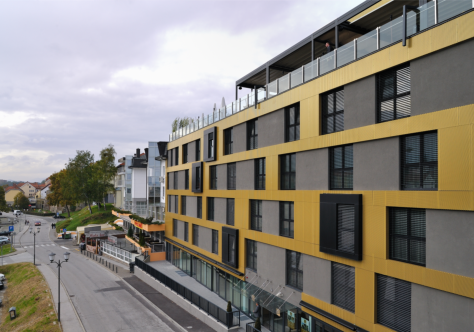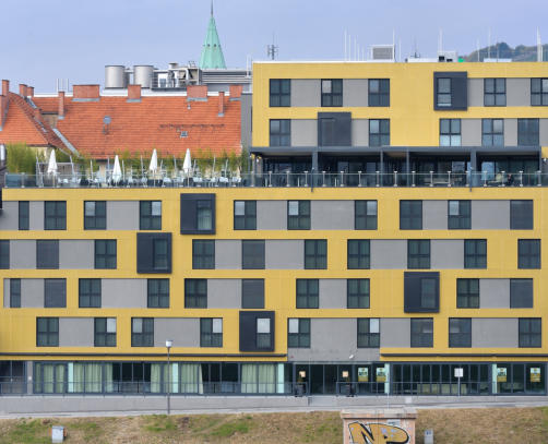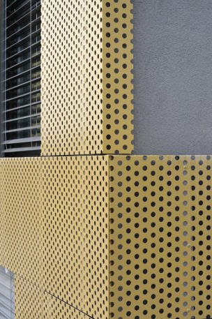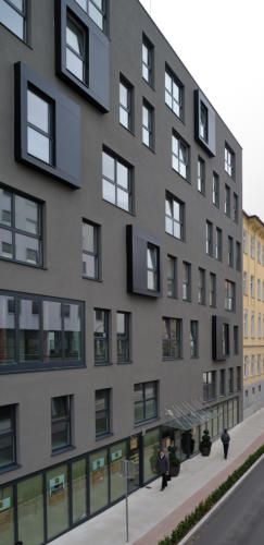 invited architectural competition for facade Maribor, Slovenia2009realization in 20111. prizeFasade design points to the double character of the building.Hotel building gets additional golden covering.Tax administration office on the north-east side is presented in dark grey
